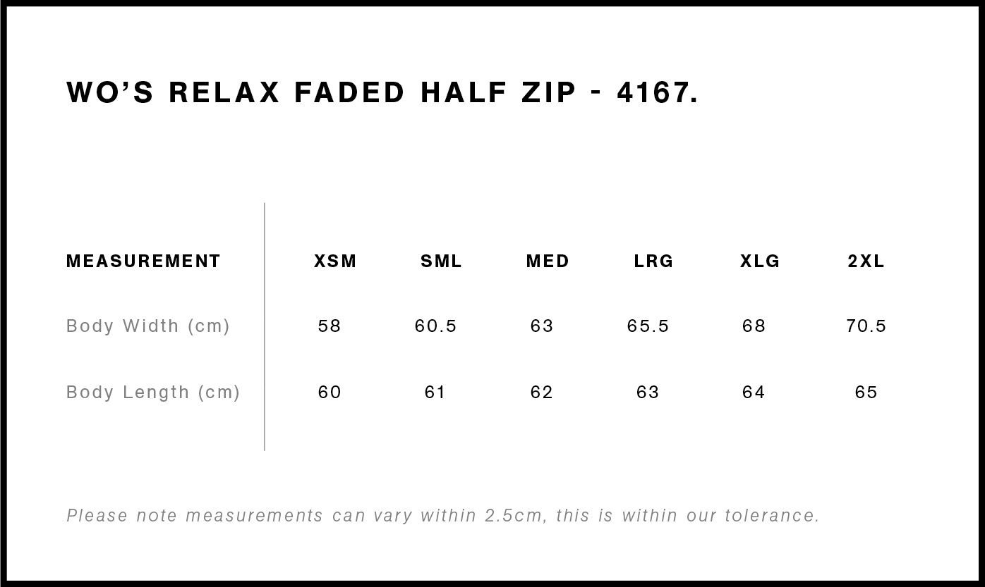 Introducing the Wo’s Relax Faded Half Zip. Made from mid-weight 320 GSM fleece with 80% cotton and 20% recycled polyester, it features a mock neck and silver zip. Preshrunk to minimise shrinkage.